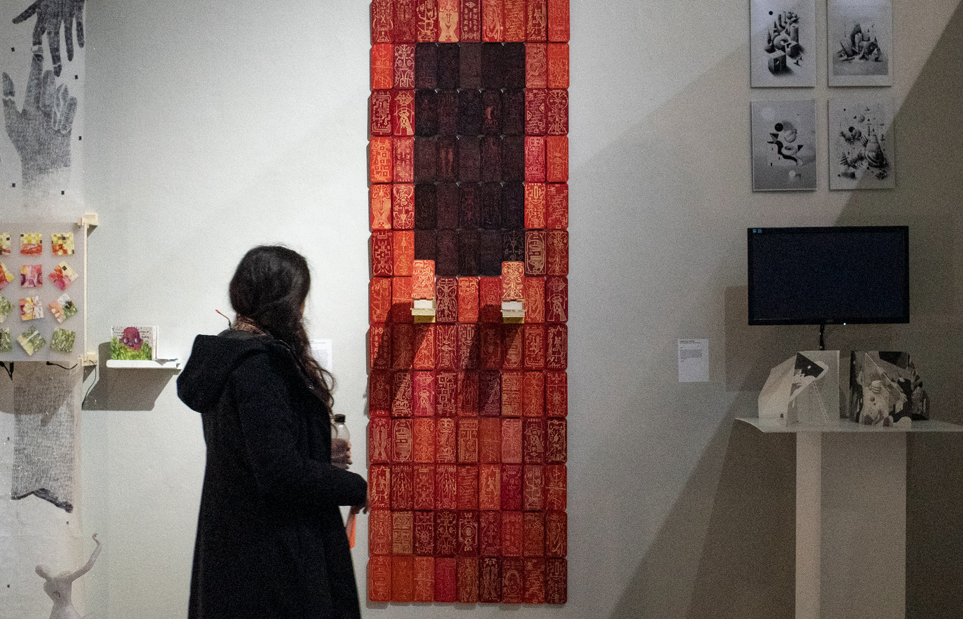 Blessed Are the Cryptic explores asemic and unintelligible signs and symbols that trigger our innate desire to decipher the unknown. The work stands like a monolith, as if it hold an authoritative power to the truth, yet it is filled with entanglement of mysterious drawings and writings, leaving our mind to wonder.